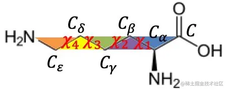 赖氨酸的转角编码方式示例:蓝色平面(C,Cα,Cβ)确定后,根据预测的蓝色-紫色平面的二面角χ1和已知的C-C键长,Cγ-Cβ-N键角即可确定Cγ的空间坐标,重复类似步骤,可以得到Cδ,Cε, N等重原子坐标。