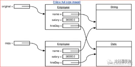 以Employee为例,它里面有一个域hireDay不是基本数据类型的变量,而是一个reference变量,经过Clone之后就会产生一个新的Date型的reference, 它和原始对象中对应的域指向同一个Date对象,这样克隆类就和原始类共享了一部分信息,而这样显然是不利的,过程下图所示: