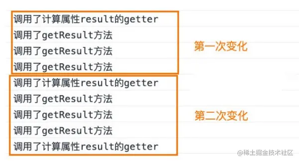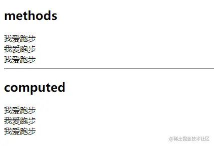 在上面的实现思路中,我们会发现计算属性和methods的实现看起来是差别是不大的,而且我们多次提到计算属性有缓存的。 接下来我们来看一下同一个计算多次使用,计算属性和methods的差异: