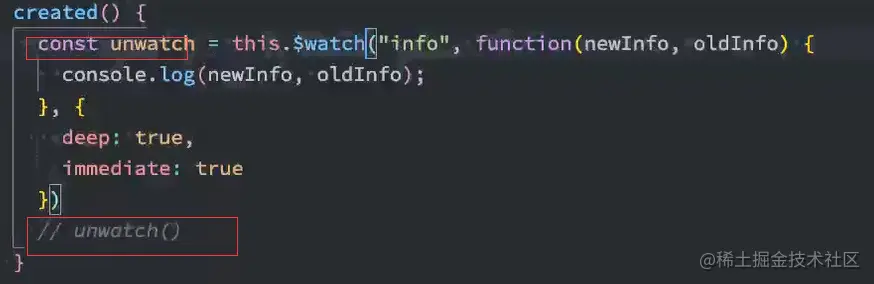 (2)另外一种就是使用 $watch 的 API,我们可以再created的生命周期中,使用 this.$watch来做侦听。