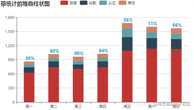 各个系列的子类数目少,可在柱形内部直接显示占比;子类目多则隐藏。