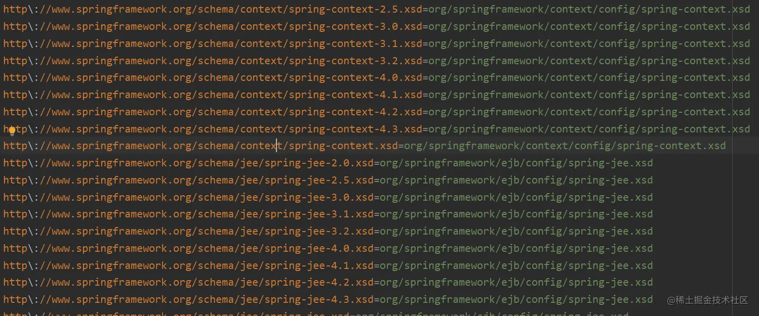 通过上图我们会发现还有一个名为spring.schemas的文件,里面存放着schem URL和schema文件路径的关系,它是XML文件解析成Document对象时,通过schema文件进行校验的。