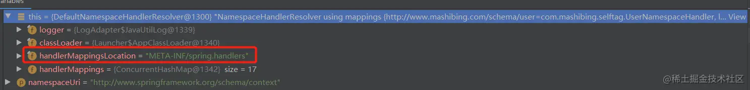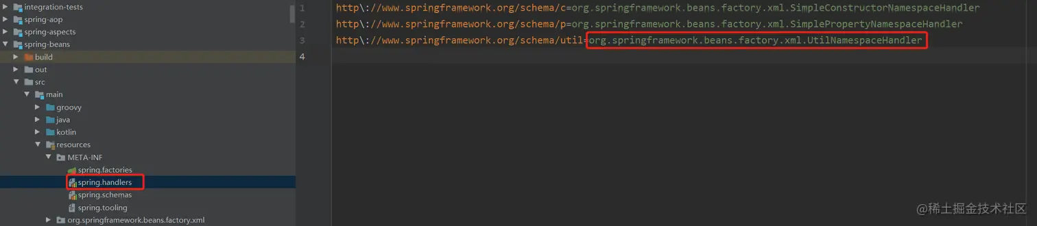 我们会发现它在META-INF目录下存放了一个spring-hadlers的文件,里面就保存着命名空间和解析器的关系。