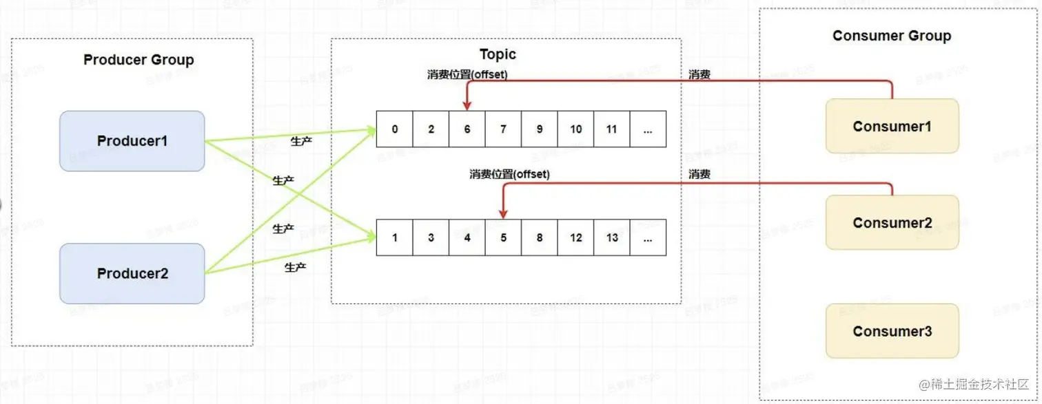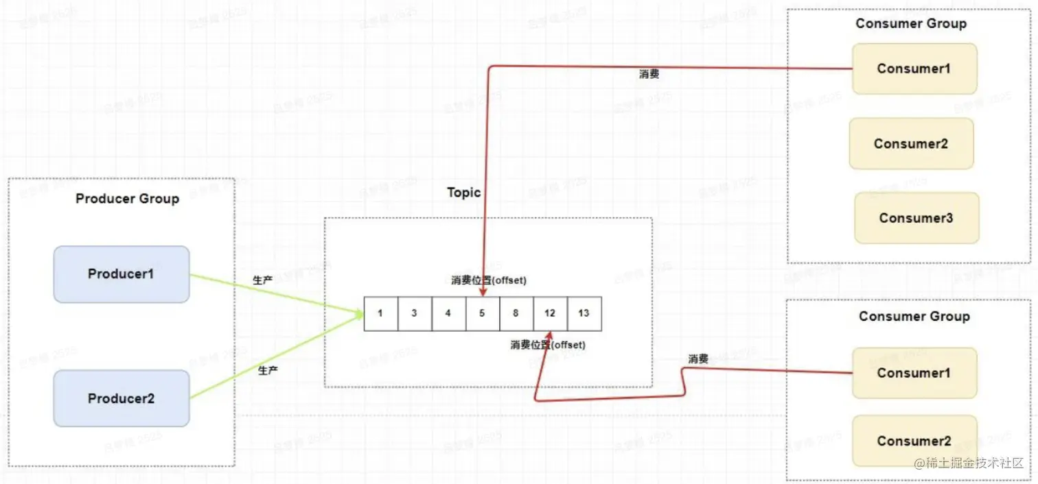 每个消费组在每个队列上维护一个消费位置,为什么呢?因为我们刚刚画的仅仅是一个消费者组,我们知道在发布订阅模式中一般会涉及到多个消费者组,而每个消费者组在每个队列中的消费位置都是不同的。如果此时有多个消费者组,那么消息被一个消费者组消费完之后是不会删除的(因为其它消费者组也需要呀),它仅仅是为每个消费者组维护一个消费位移(offset),每次消费者组消费完会返回一个成功的响应,然后队列再把维护的消费位移加一,这样就不会出现刚刚消费过的消息再一次被消费了。