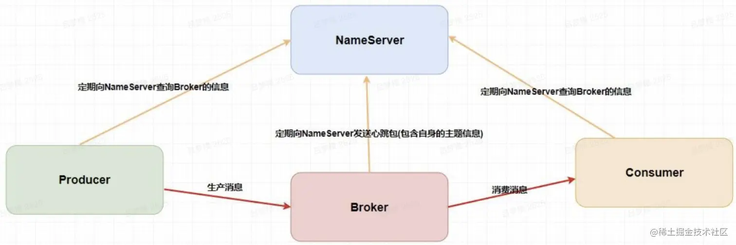 - NameServer:不知道你们有没有接触过 ZooKeeper 和 Spring Cloud 中的 Eureka,它其实也是一个注册中心,主要提供两个功能:Broker 管理和路由信息管理。说白了就是 Broker 会将自己的信息注册到 NameServer 中,此时 NameServer 就存放了很多 Broker 的信息(Broker的路由表),消费者和生产者就从 NameServer 中获取路由表然后照着路由表的信息和对应的 Broker 进行通信(生产者和消费者定期会向 NameServer 去查询相关的 Broker 的信息)。