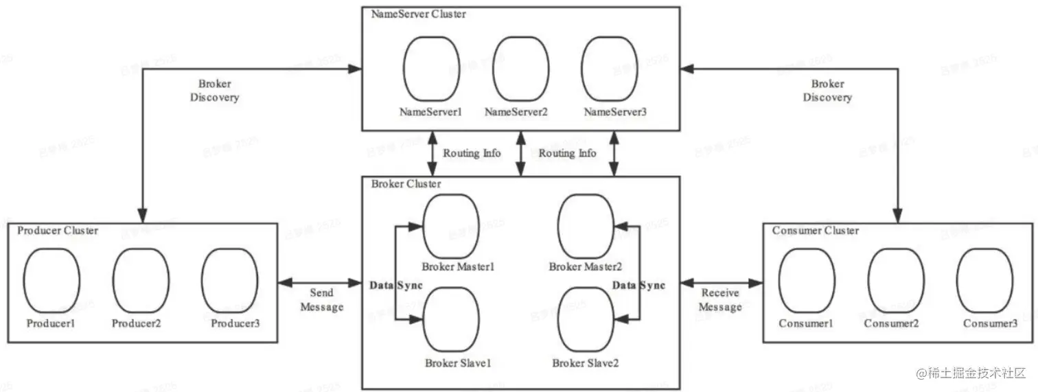 - NameServer:一个功能齐全的服务器,其角色类似Dubbo中的Zookeeper。