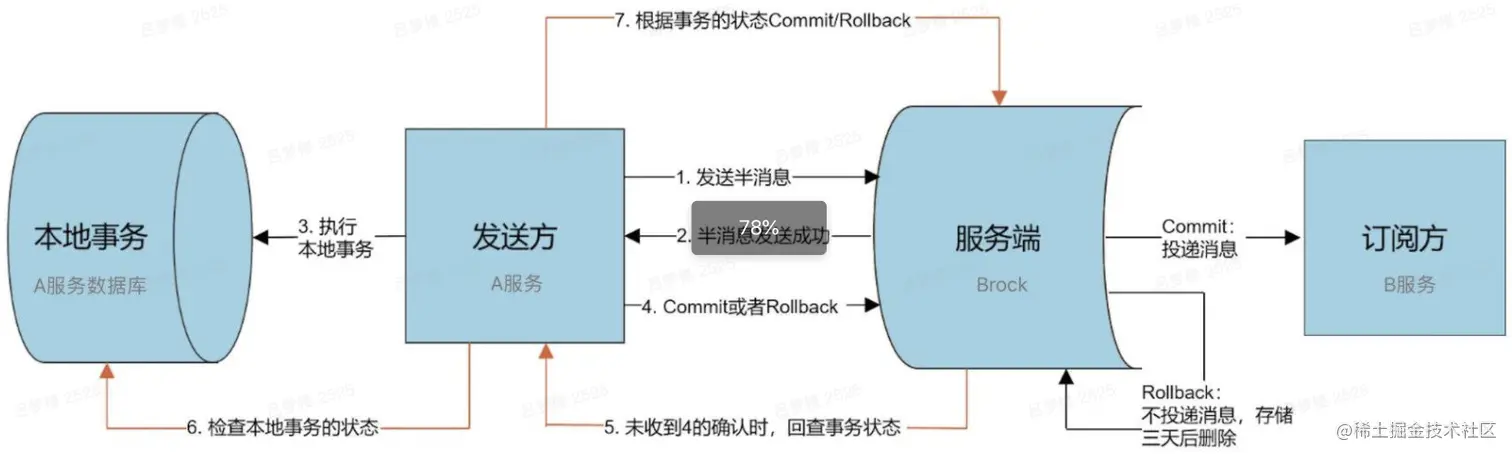 - 如果本地事务失败,那么Product像Brock服务器发送Rollback,那么就会直接删除上面这条半消息。