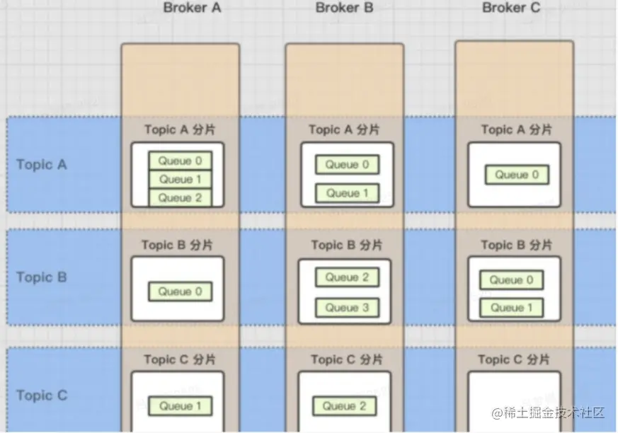 - Broker:主要负责消息的存储、投递和查询以及服务高可用保证。说白了就是消息队列服务器嘛,生产者生产消息到 Broker,消费者从 Broker 拉取消息并消费。这里,我还得普及一下关于 Broker、Topic 和队列的关系。上面我讲解了 Topic 和队列的关系——一个 Topic 中存在多个队列,那么这个 Topic 和队列存放在哪呢?一个 Topic 分布在多个 Broker 上,一个 Broker 可以配置多个 Topic,它们是多对多的关系。如果某个 Topic 消息量很大,应该给它多配置几个队列,并且尽量多分布在不同 Broker 上,以减轻某个 Broker 的压力。Topic 消息量都比较均匀的情况下,如果某个 broker 上的队列越多,则该 broker 压力越大。