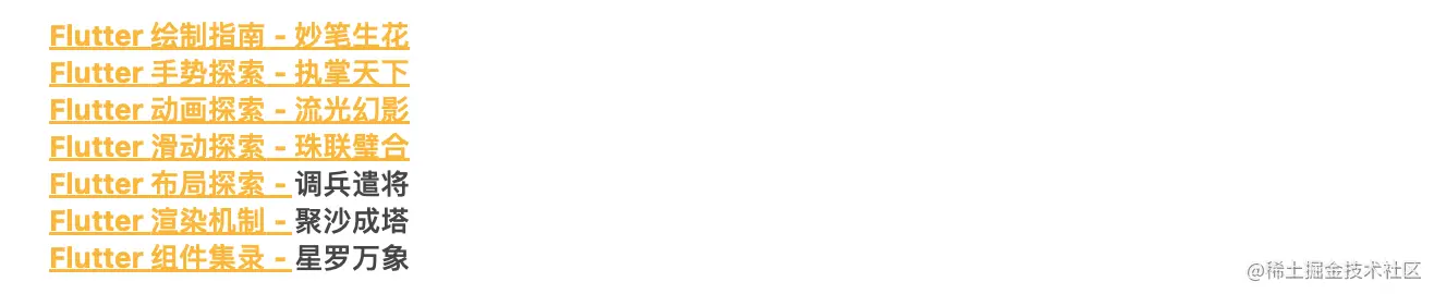 Painting 绘制模块: 《Flutter 绘制指南 - 妙笔生花》Gestures 手势模块: 《Flutter 手势探索 - 指掌天下》Animation 动画模块:《Flutter 动画探索 - 流光幻影》Flutter 滑动探索:《Flutter 滑动探索 - 珠联璧合》