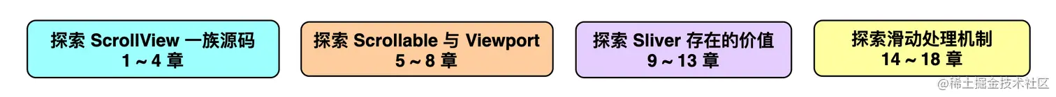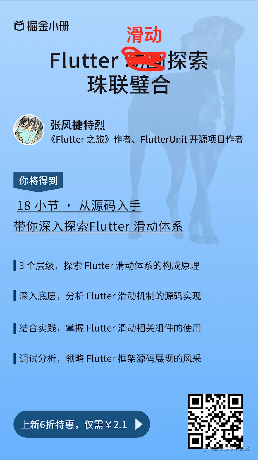 在此之前已经发布了三本小册,分别针对 Flutter 中的 绘制 、手势 、动画 进行系统的介绍。现在,又加入了一位新兄弟 Flutter 滑动探索 :