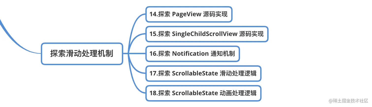 最后一部分,是对滑动处理机制的探索。开始通过对 PageView 和 SingleChildScrollView 组件的源码实现进行分子,然后介绍 Notification 通知机制,在前面知识的铺垫下,最后对 ScrollableState 中拖动事件的回调处理进行分析。