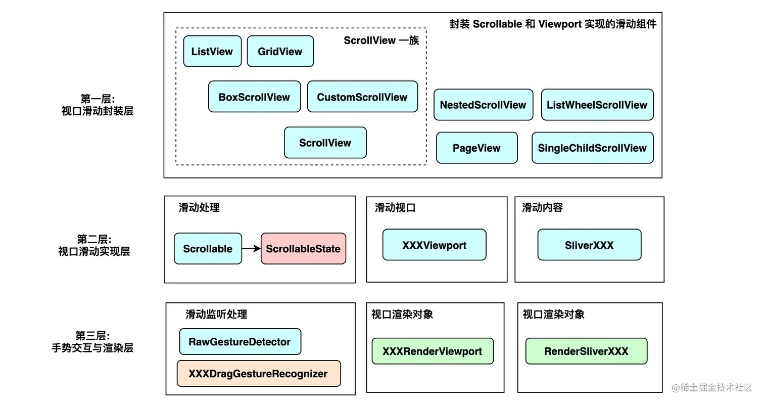 滑动机制 可以看做是对框架层的一个承上启下体系。向上可以连接到 滑动组件 Widget 层 ,向下可以连接到 手势 Gesture 层 、动画 Animation 层 ;在 视口 和 Sliver 内容相关实现中,还会涉及到 渲染 Rendering 层 的知识。所以选取对 滑动体系 的探索作为第四本 Flutter 小册的内容。