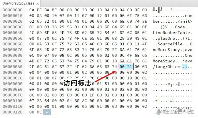 之前的例子OneMoreStudy是一个普通的类,不是接口、注解或枚举,只被public修饰,没有被声明为final或abstract,而且是JDK 1.7编译的,所以只有ACC_PUBLIC和ACC_SUPER为true,所以它的访问标志应该是0x0001 | 0x0020 = 0x0021,如下图: