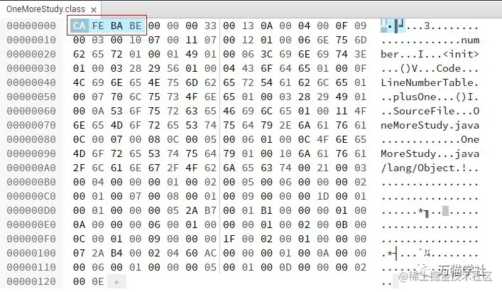 使用JDK 1.7把这段代码编译成Class文件,用HexEd打开,就可以到魔数了,如下图: