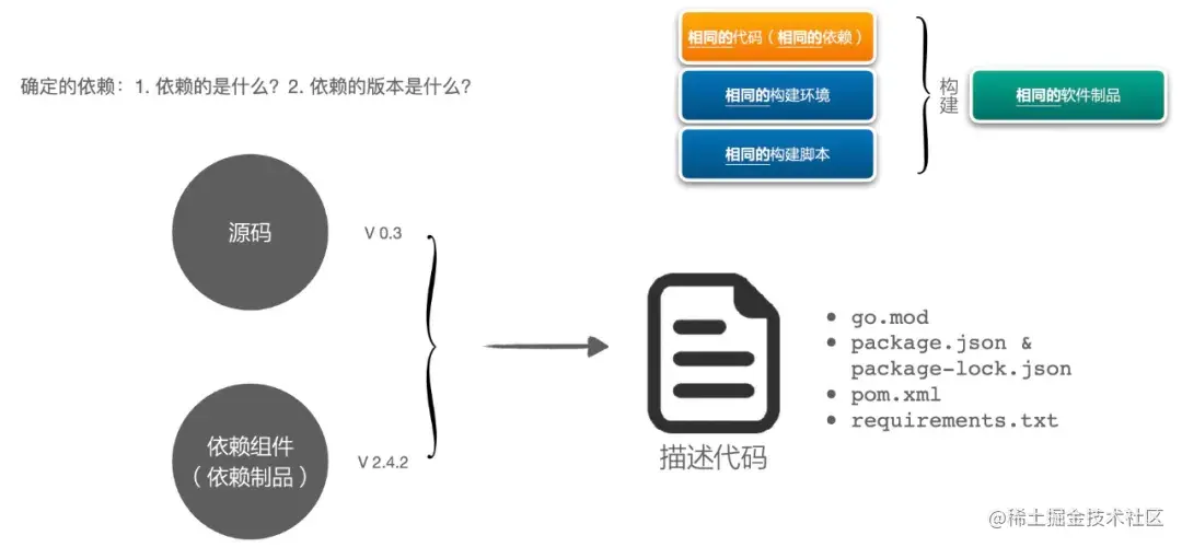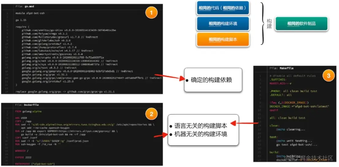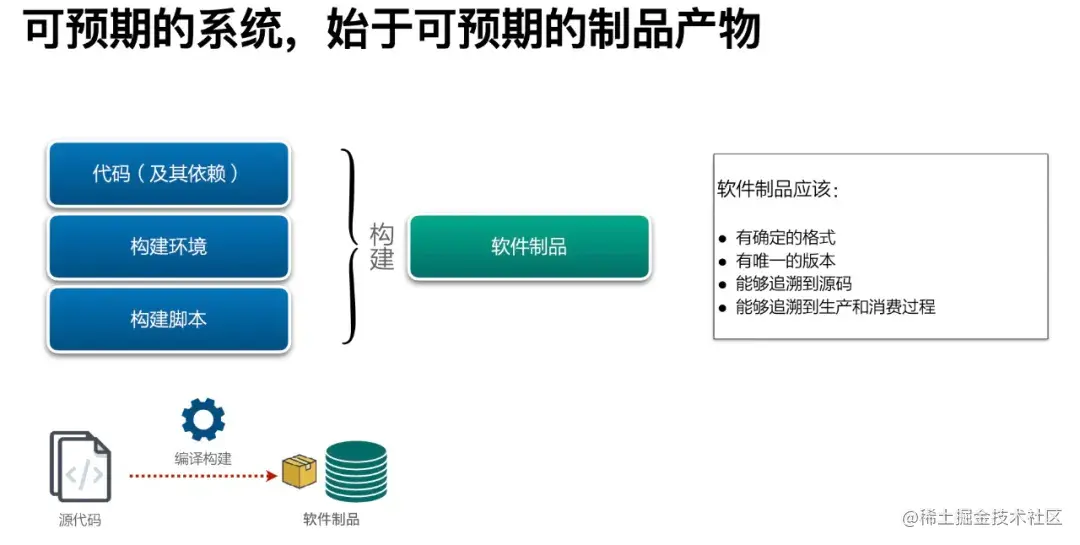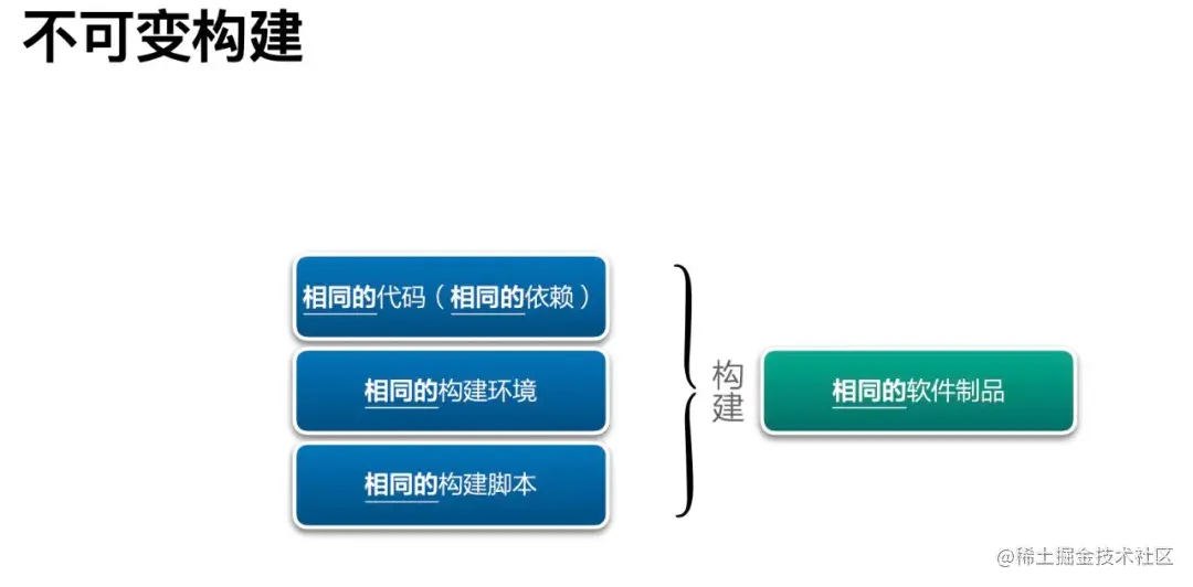 只有在同一份代码(及同一个依赖)、同样构建环境的描述、和同样构建脚本的环境下,所产生的软件制品才是相同的。这里强调的是说所有的东西都要保证一致性,如果说三者是一样的话,那产生出来的制品也是一样的,即使构建时间不同,产出的制品也是相同的。