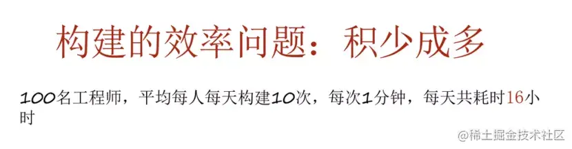 这是一个非常大的数据,也是非常大的损耗。很多时候一个项目的工程效率太低的原因就是因为构建太慢。构建耗时过长使得制品迭代非常慢,功能更新和bug修复也会受到影响。