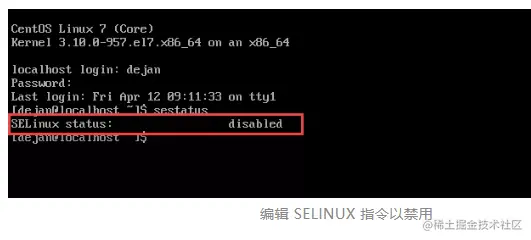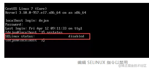 重新启动后,检查服务状态以确认 SELinux 已禁用。使用命令: