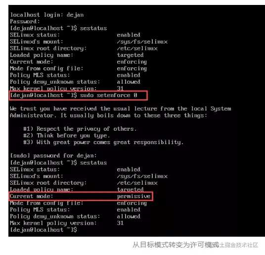 在sudo setenforce 0中,你可以使用permissive而不是 0。
