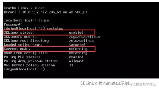 下面的示例输出表明SELinux 已启用。状态显示服务处于强制执行 模式。