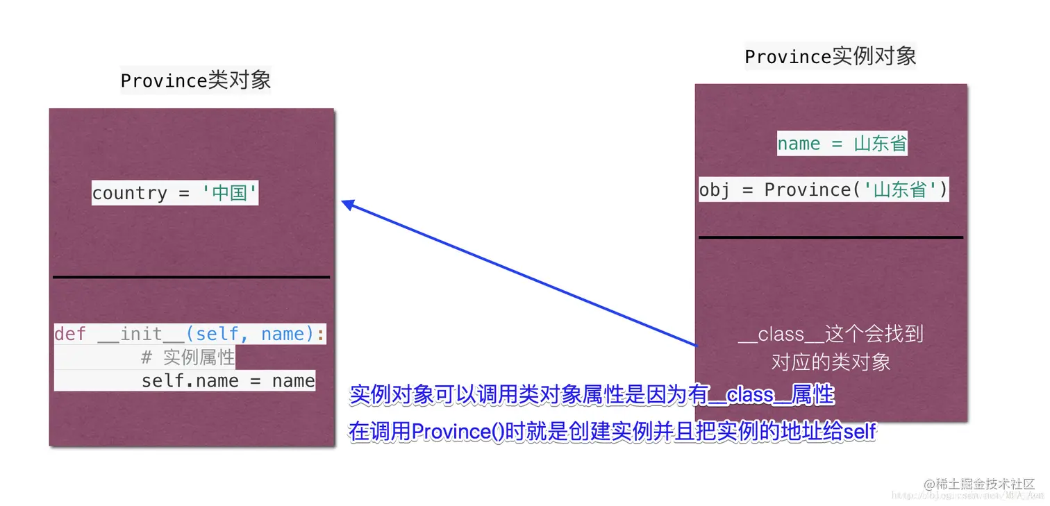 实例对象在创建时,由Python解释器自动赋予了一个特殊的属性即class(可以认为是魔法属性)。该属性的作用是:会找到相对应的实例对象的类对象内存地址。
