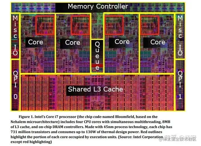 需要指出的是,上面的对比,并没有做到完全基于第一性原理的公平性,比如Intel Core i7-920的工艺是45nm,而GTX580是40nm,集成的晶体管数量也存在明显的差异(30B v.s. 0.731B)。不过考虑到i7-920的架构设计中,只有不到20%的芯片面积用于实际计算,(参见下图:*www.nvidia.com/content/PDF…