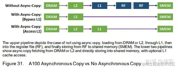 - 引入了用于异步数据copy的LDGSTS指令,可以bypass寄存器的中转,直接从global memory里将数据加载到shared memory,减少了寄存器的压力和不必要的数据中转,进一步节省了功耗。并且因为这条指令的异步性,可以作为背景操作和前台的计算指令overlap执行,进一步提升整体计算效率。