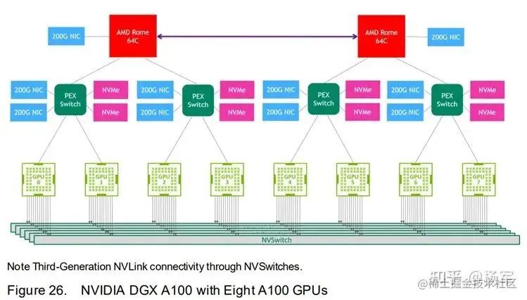 - 第三代NVLink(NVSwitch)。Ampere架构的NVSwitch和上一代的区别是将带宽提升了一倍,理论上,任意两块GPU之间,都可以达到最高达600GB/s的双向带宽。