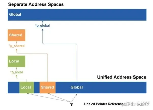 - load/store地址位宽由32-bit提升到64-bit,为统一地址访问提供了基础条件。比如local memory,shared memory,global memory进行统一编址(参见下面的一张示意图)。
