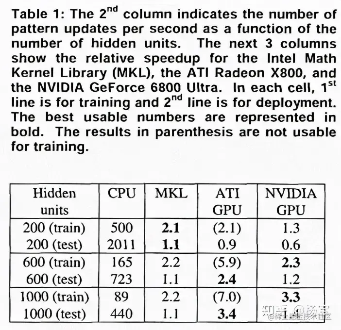 有趣的是在,这篇文章的脚注里提到了除了在NVIDIA GeForce 7800 Ultra(*www.techpowerup.com/gpu-specs/g… Pentium 4(*en.wikipedia.org/wiki/Pentiu… Radeon X1900(*www.techpowerup.com/gpu-specs/r…, ATI GPU, NV GPU上同时进行MLP加速实验对比的一些数据,看起来当时还互有千秋。
