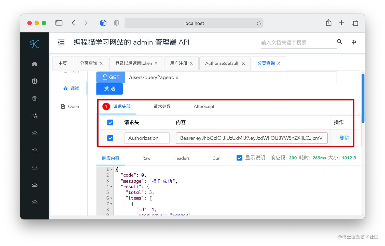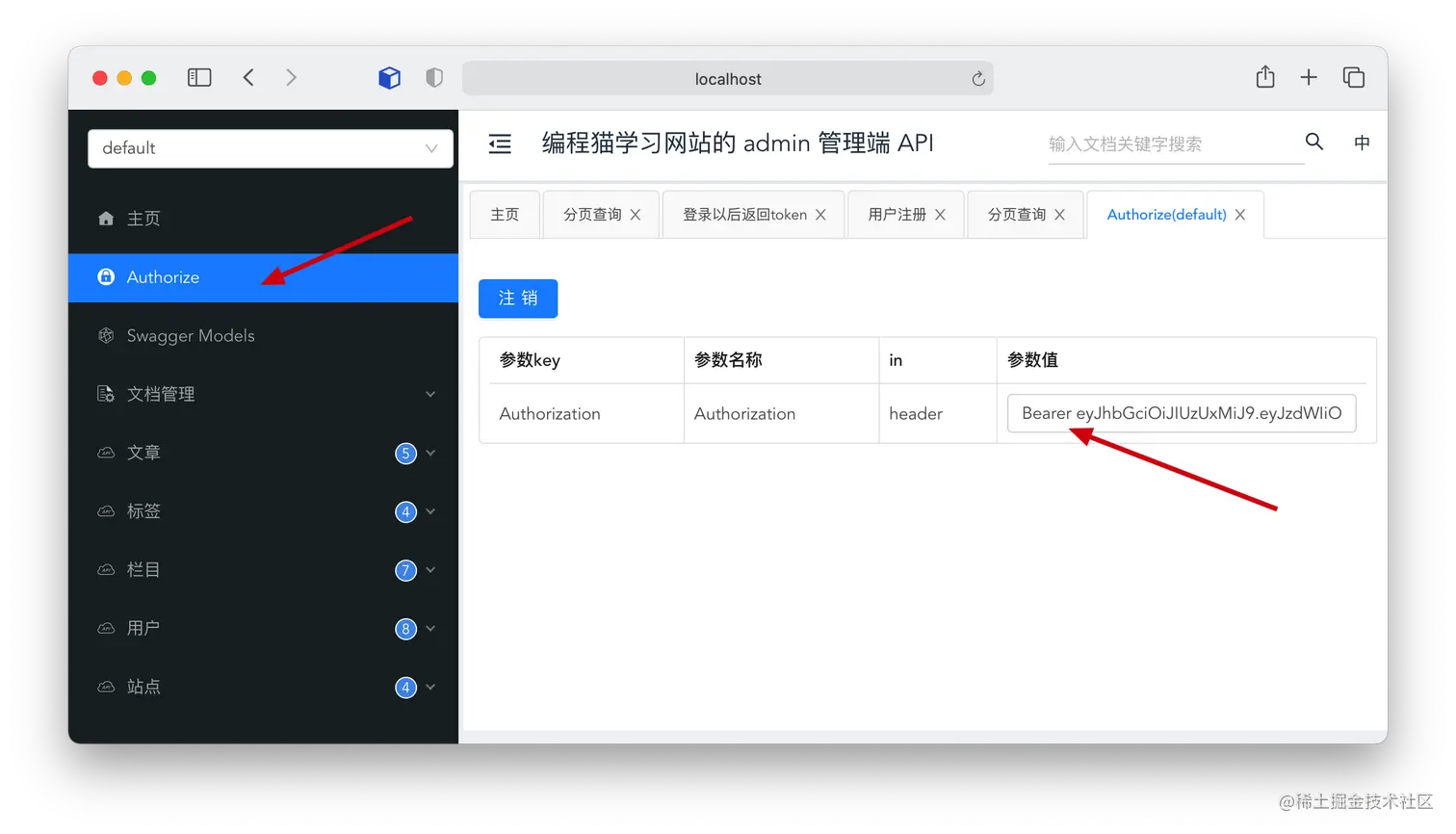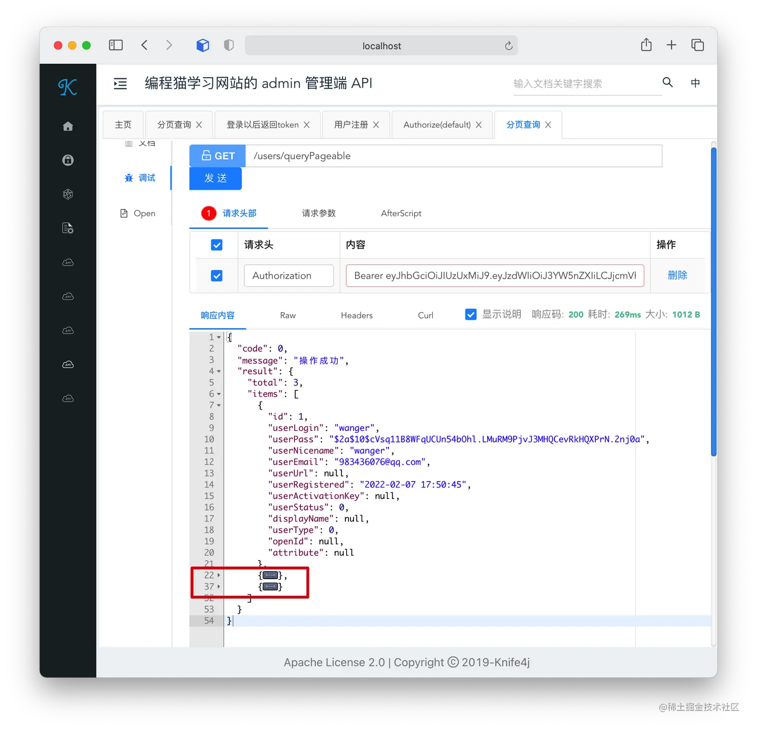 Knife4j 和 Swagger 一样,也是支持头部登录认证的,点击「authorize」菜单,添加登录后的信息即可保持登录认证的 token。