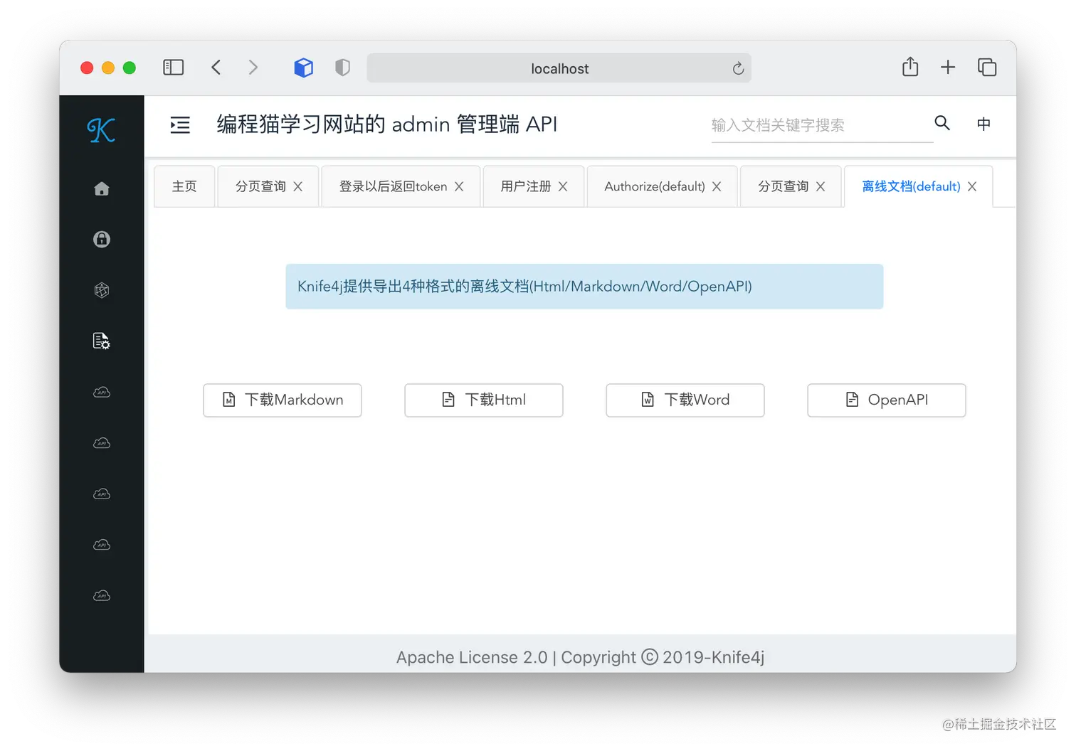 Knife4j 支持把 API 文档导出为离线文档(支持 markdown 格式、HTML 格式、Word 格式),