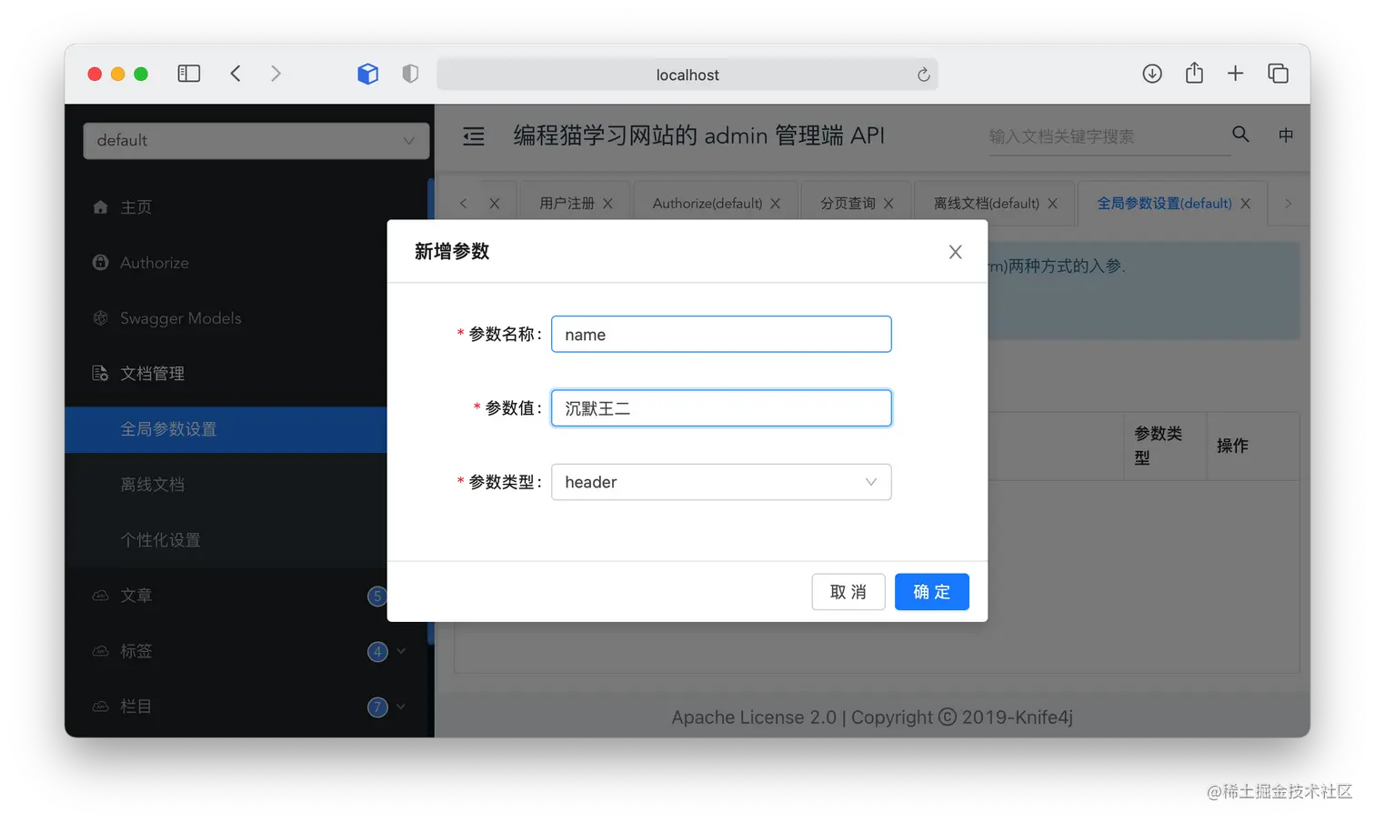当某些请求需要全局参数时,这个功能就很实用了,Knife4j 支持 header 和 query 两种方式。