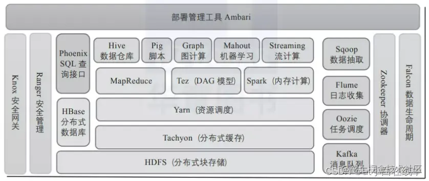 10)Tez: 完整的数据流编程框架,基于YARN建立,提供强大而灵活的引擎,可执行任意有向无环图(DAG)数据处理任务,既支持批处理又支持交互式的用户场景。Tez已经被Hive、Pig等Hadoop生态圈的组件所采用,用来替代 MapReduce作为底层执行引擎。