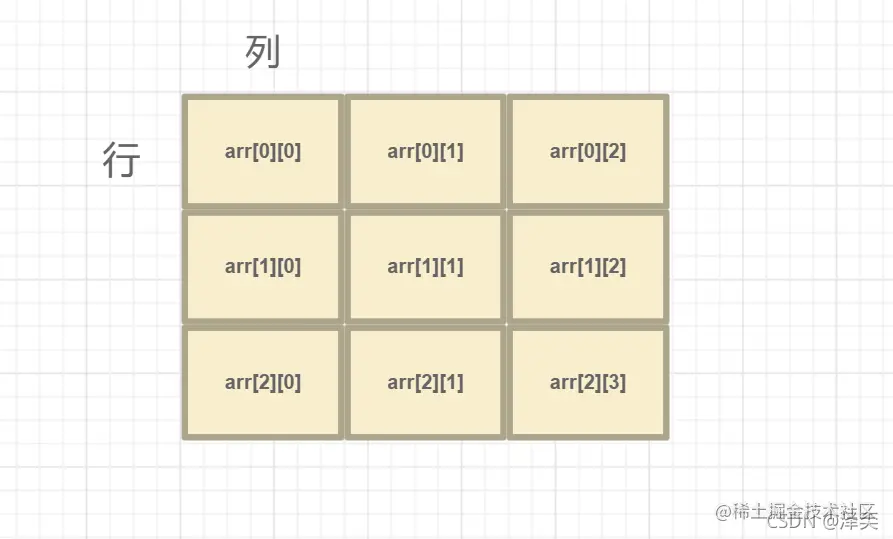 - 例如: a[3][4];表示 a 数组三行四列的元素。