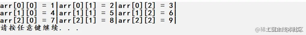 上述代码声明了一个 3 行 3 列的二维数组,其 数组名 是 array,其下标变量的类型为整形。