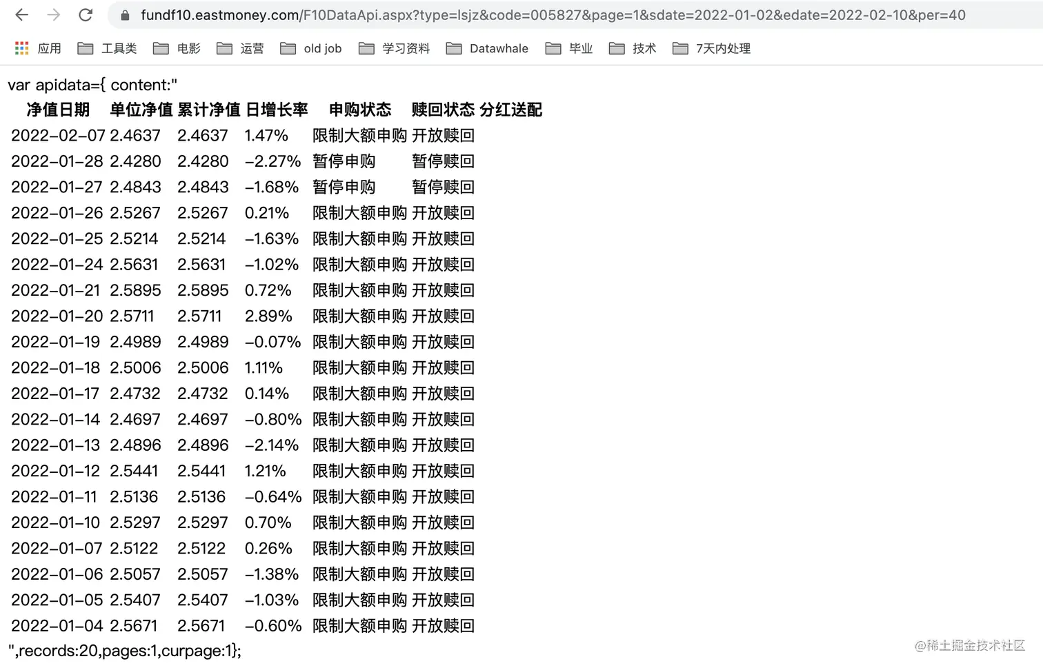 根据指定参数,浏览器会返回指定参数,一段js赋值代码,包括了 基金数据(content)、总记录条数(records)、总页数(pages)、当前页数(curpage)。