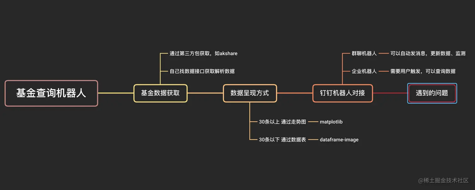 老早就想搞个基金监控机器人了,方便自己查看自己关注基金的各种指数涨跌情况,及时进行止损或者止盈,从今天开始,我们先建楼基,手把手带大家实现一个基金查询机器人,目前主要可以查询基金指定日期段数据和查看基金净值走势图,后面慢慢新增功能。
