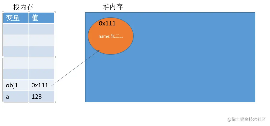 对象是保存到计算机的堆内存中的,没创建一个新的对象,就会在堆内存中开辟一个新的空间(也叫地址);而定义的对象的变量保存的是对象的内存地址(也叫对象的引用)。
