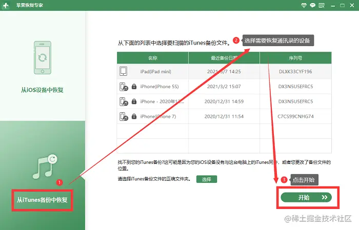 步骤一: 同样安装数据蛙苹果恢复专家,选择“从iTunes备份中恢复”,然后点击“开始”。