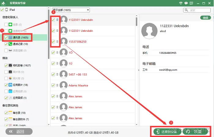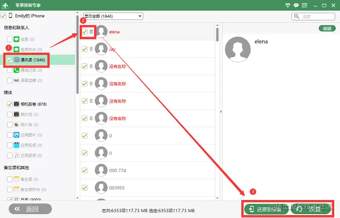 步骤二: 点击“通讯录”,选择需要恢复的联系人,最后点击“还原到设备”或者“恢复”。