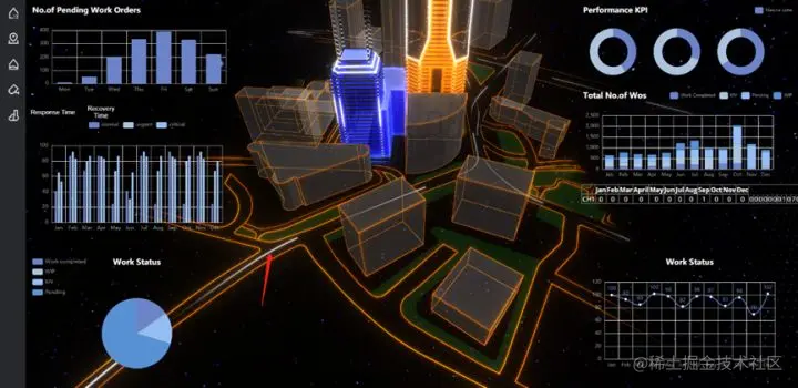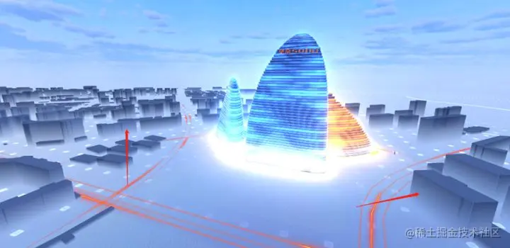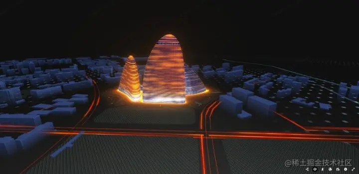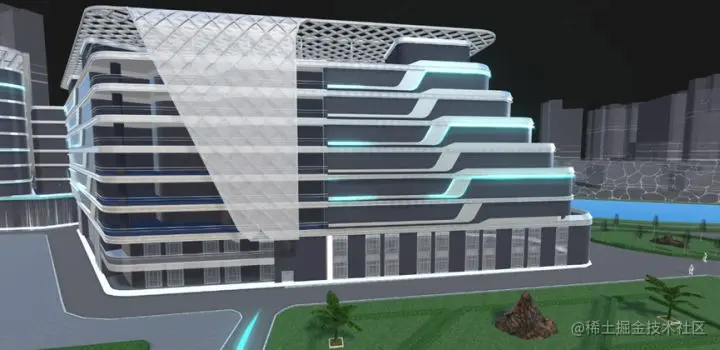 园区的画面层次要有轻重。最显眼第一层的应该是园区或者是园区中的主建筑。主建筑中最显眼的应该是建筑上的灯箱大LOGO,或者玻璃,其次是大范围的建筑。第二层级应该是四周流动的道路,通常应该是发光的流动光线。第三层级应该是周边数据生成的辅楼。第四层级应该是地面和远景天空盒。