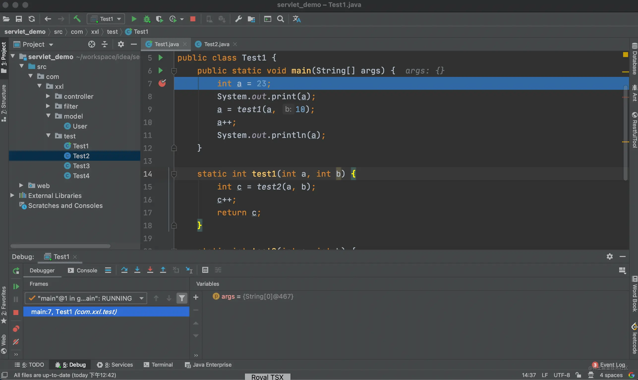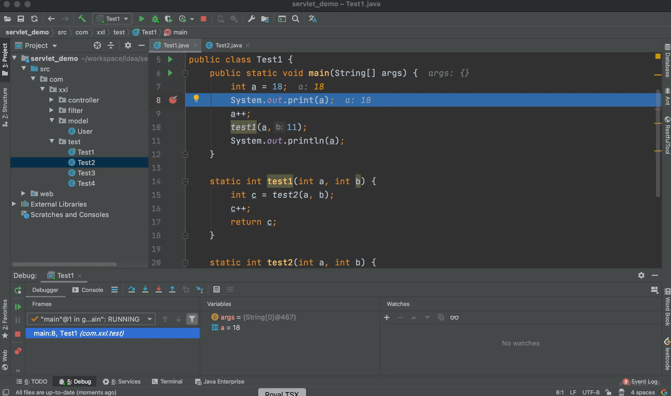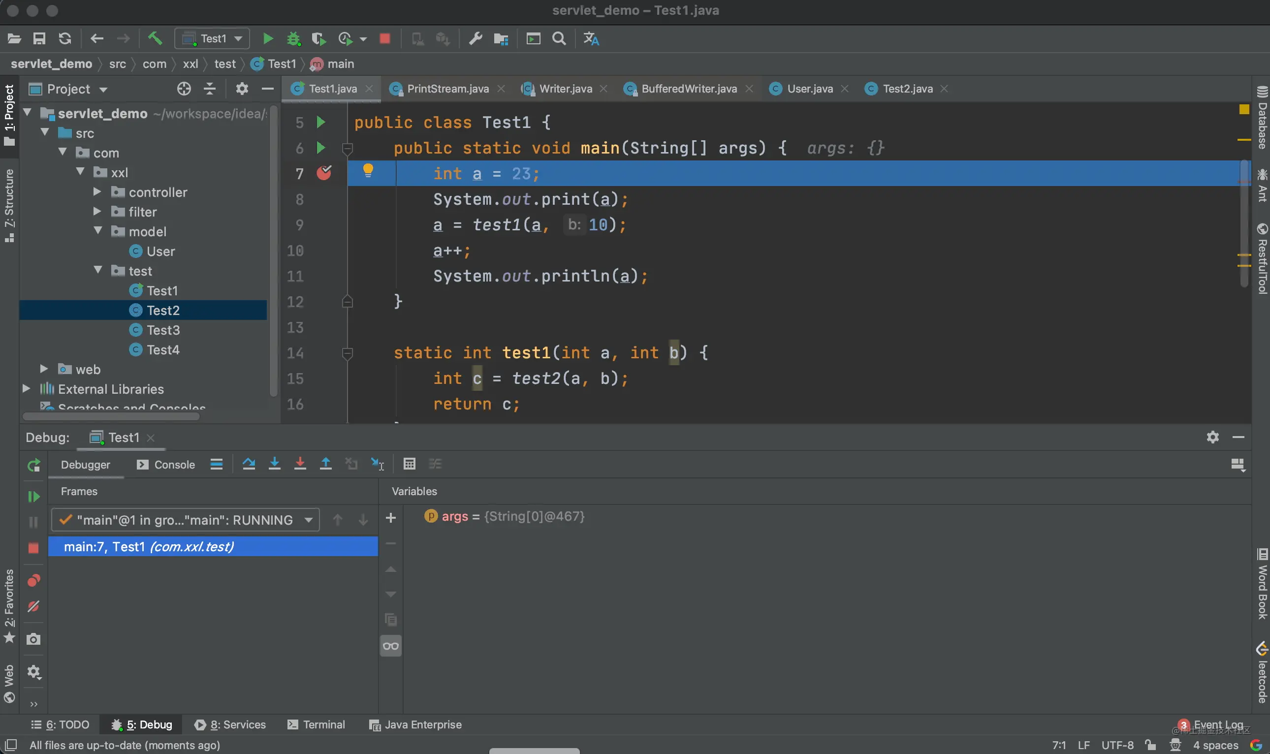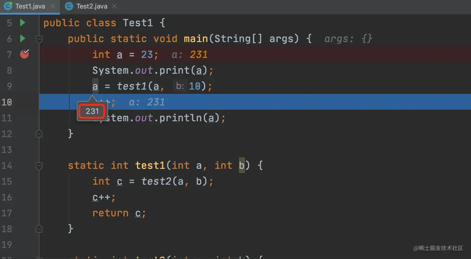 上面的例子中我们进入到了 test1 方法的内部,当点击步出按钮后,又回到了调用 test1 方法的地方。