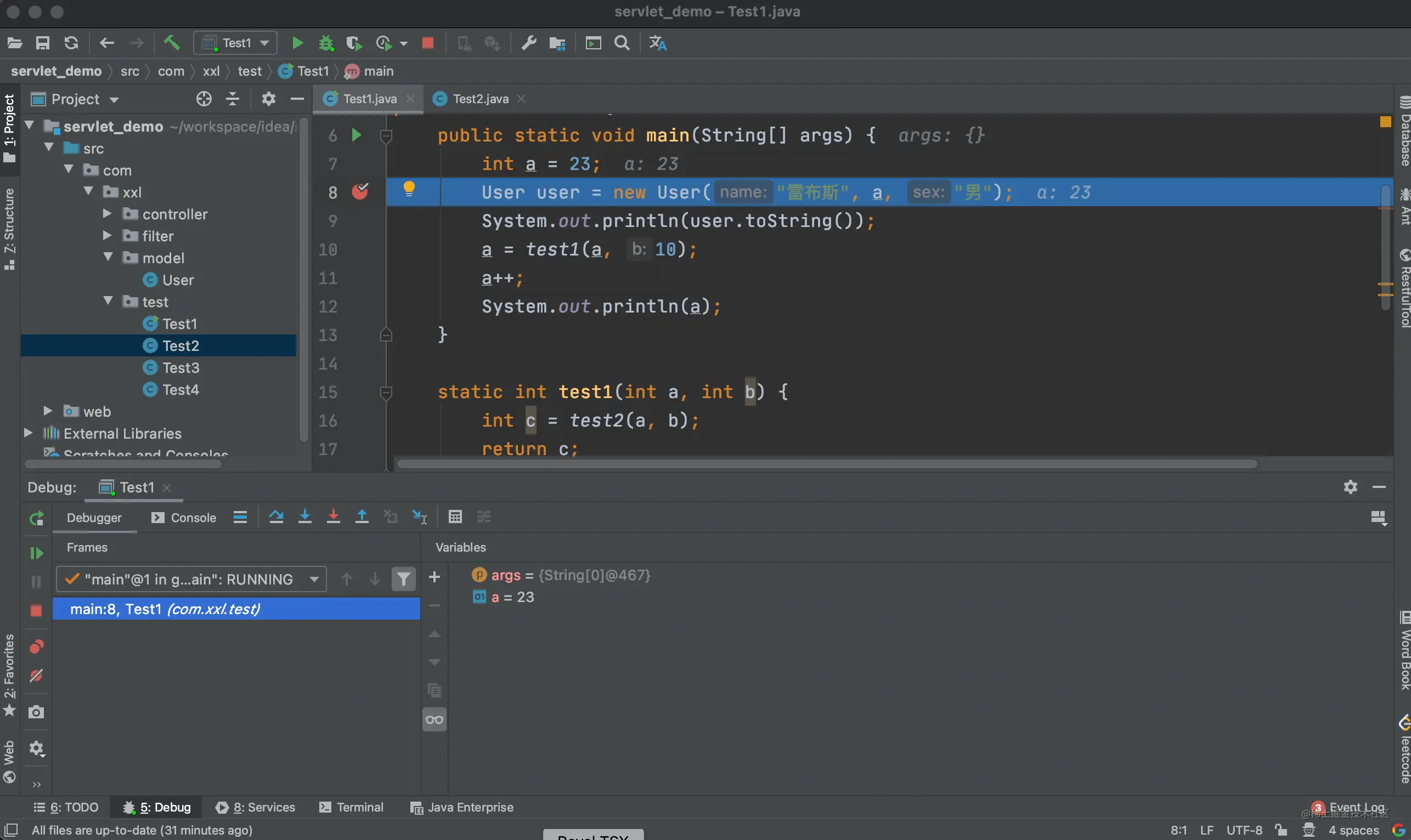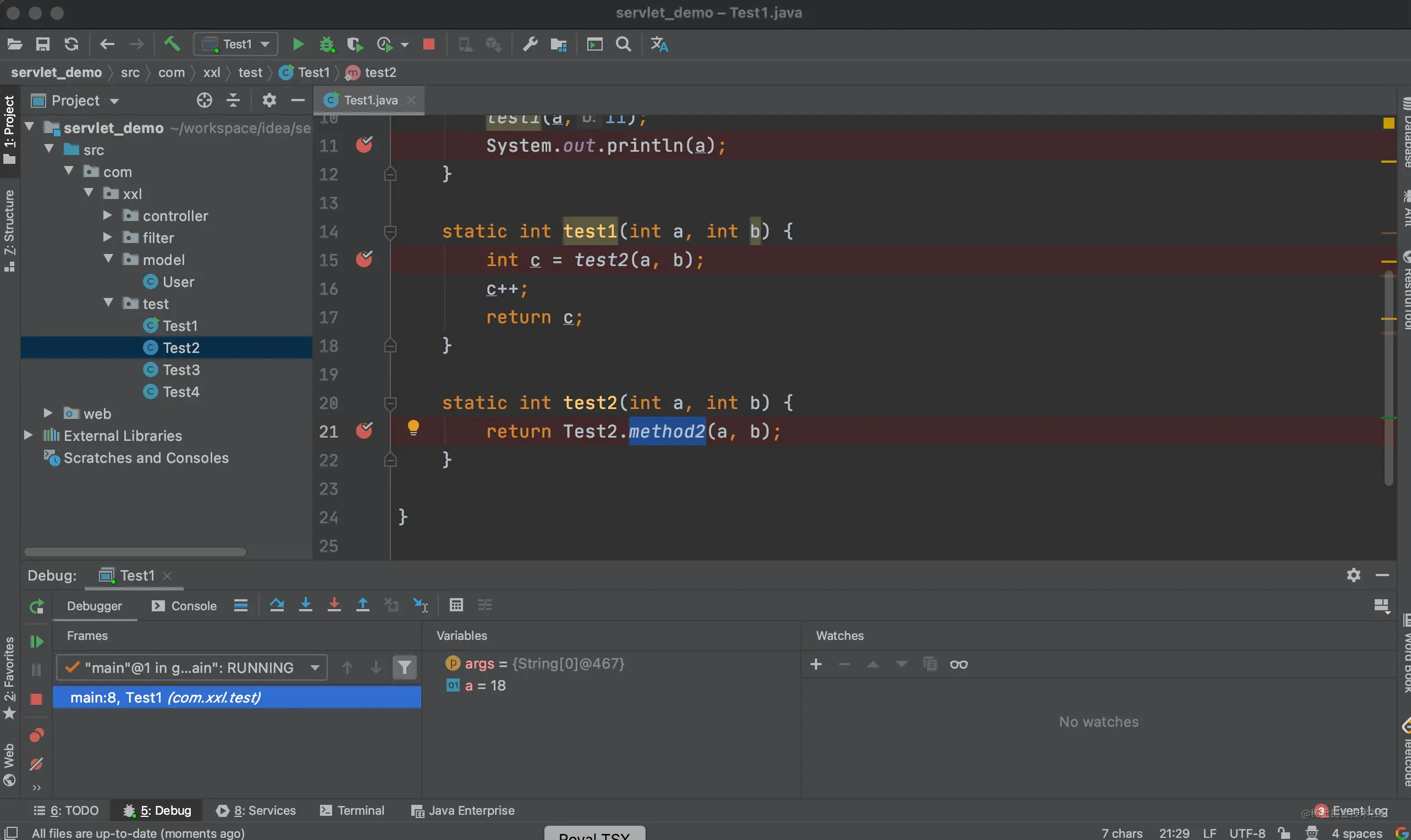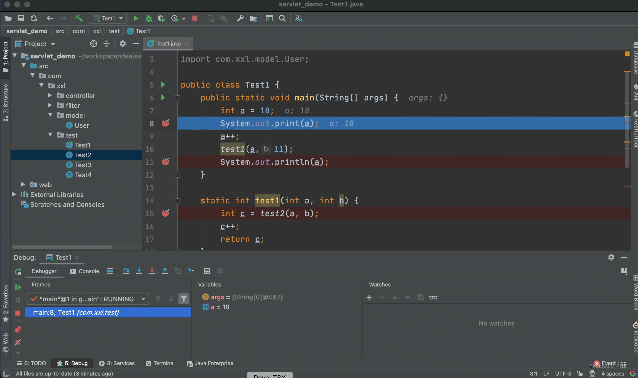 上面的例子中我们进入到了 test1 方法的内部,当点击步出按钮后,又回到了调用 test1 方法的地方。