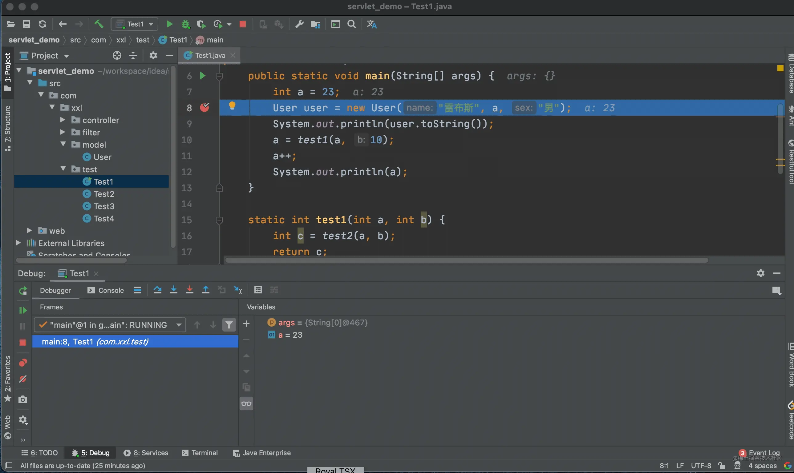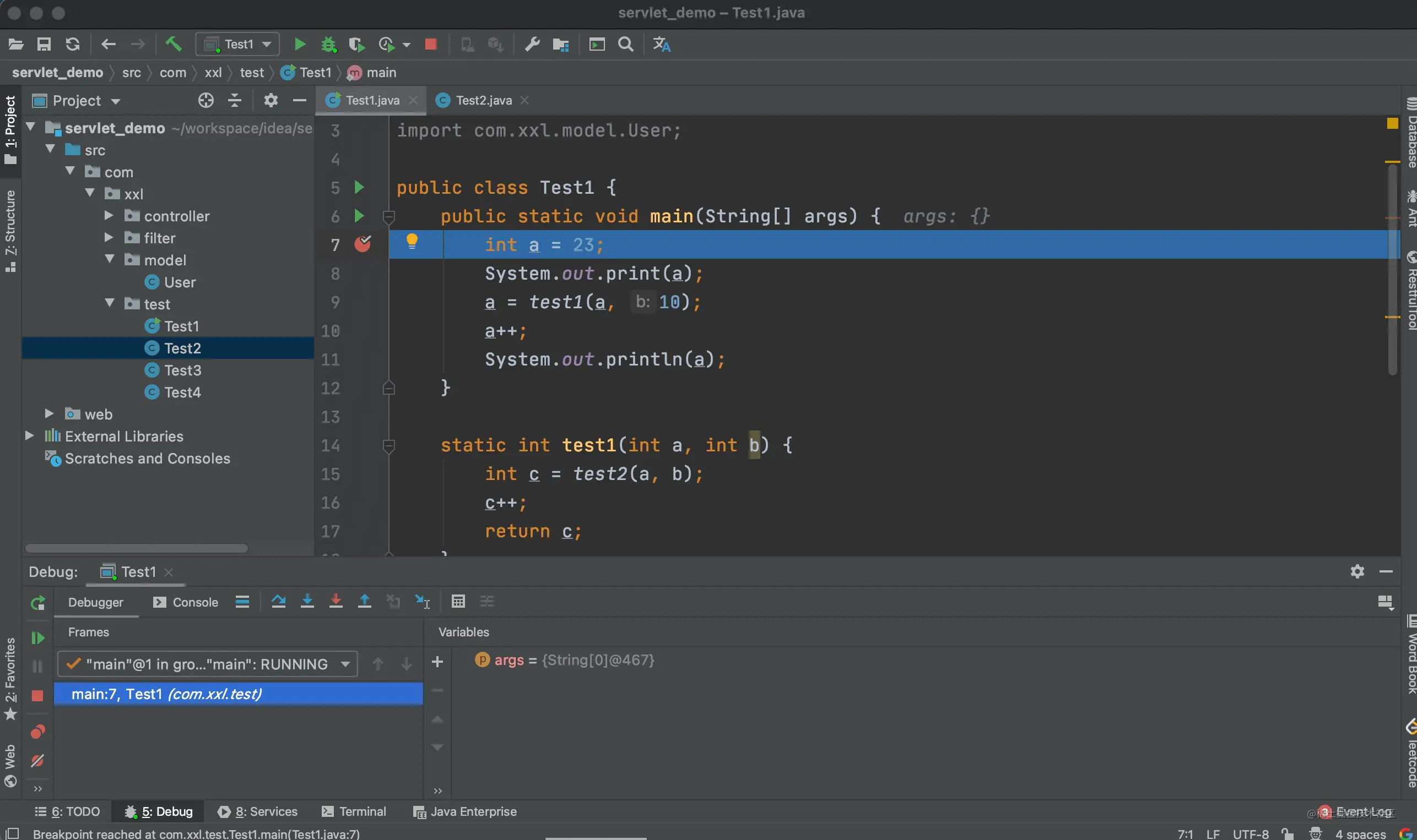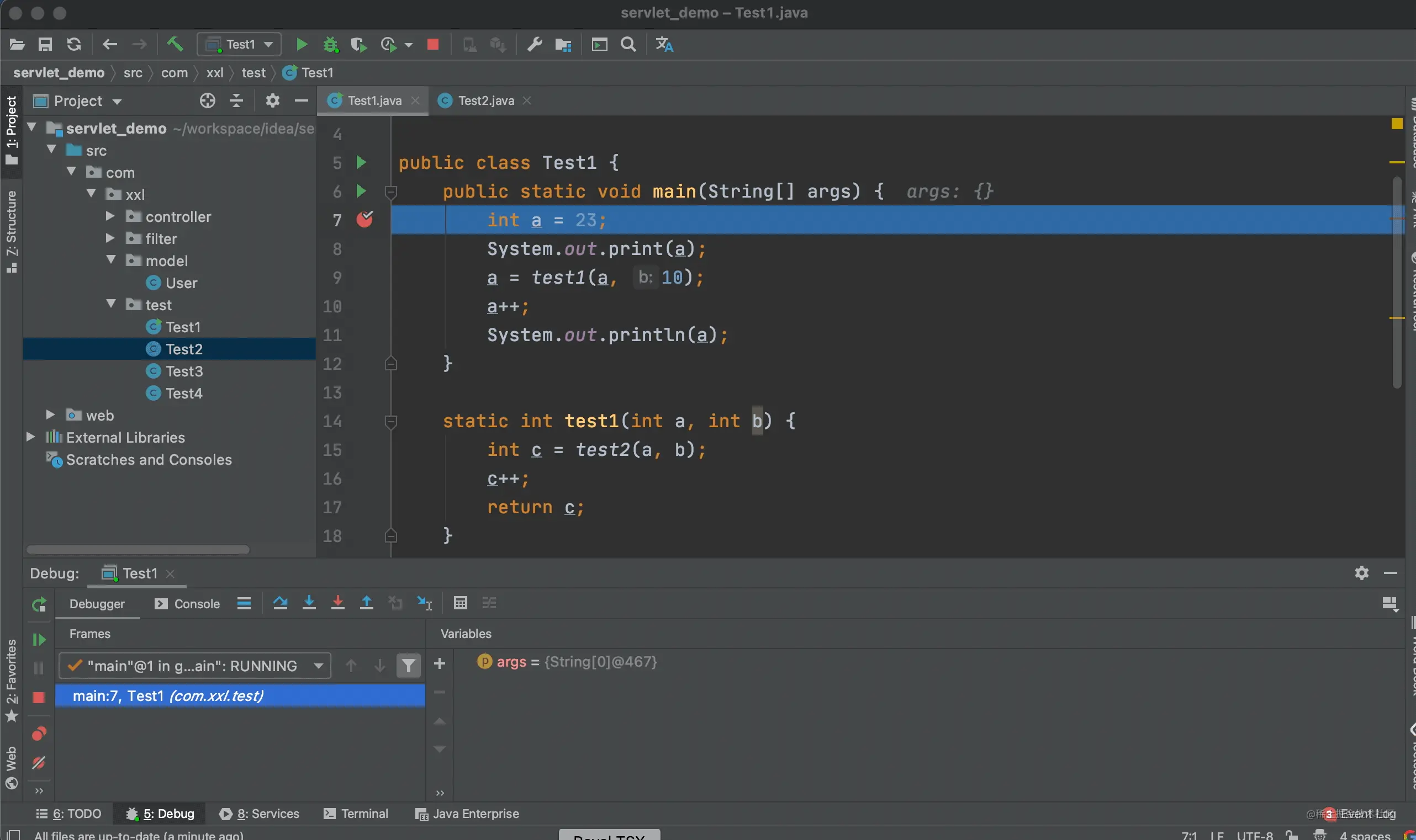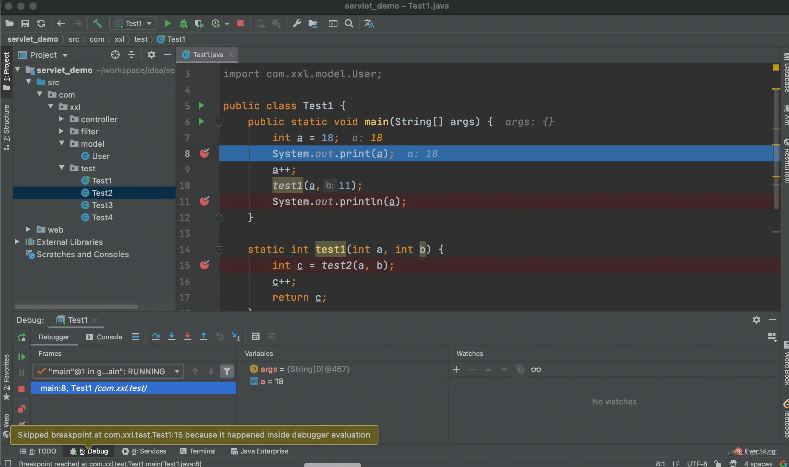 上面的例子中我们进入到了 test1 方法的内部,当点击步出按钮后,又回到了调用 test1 方法的地方。