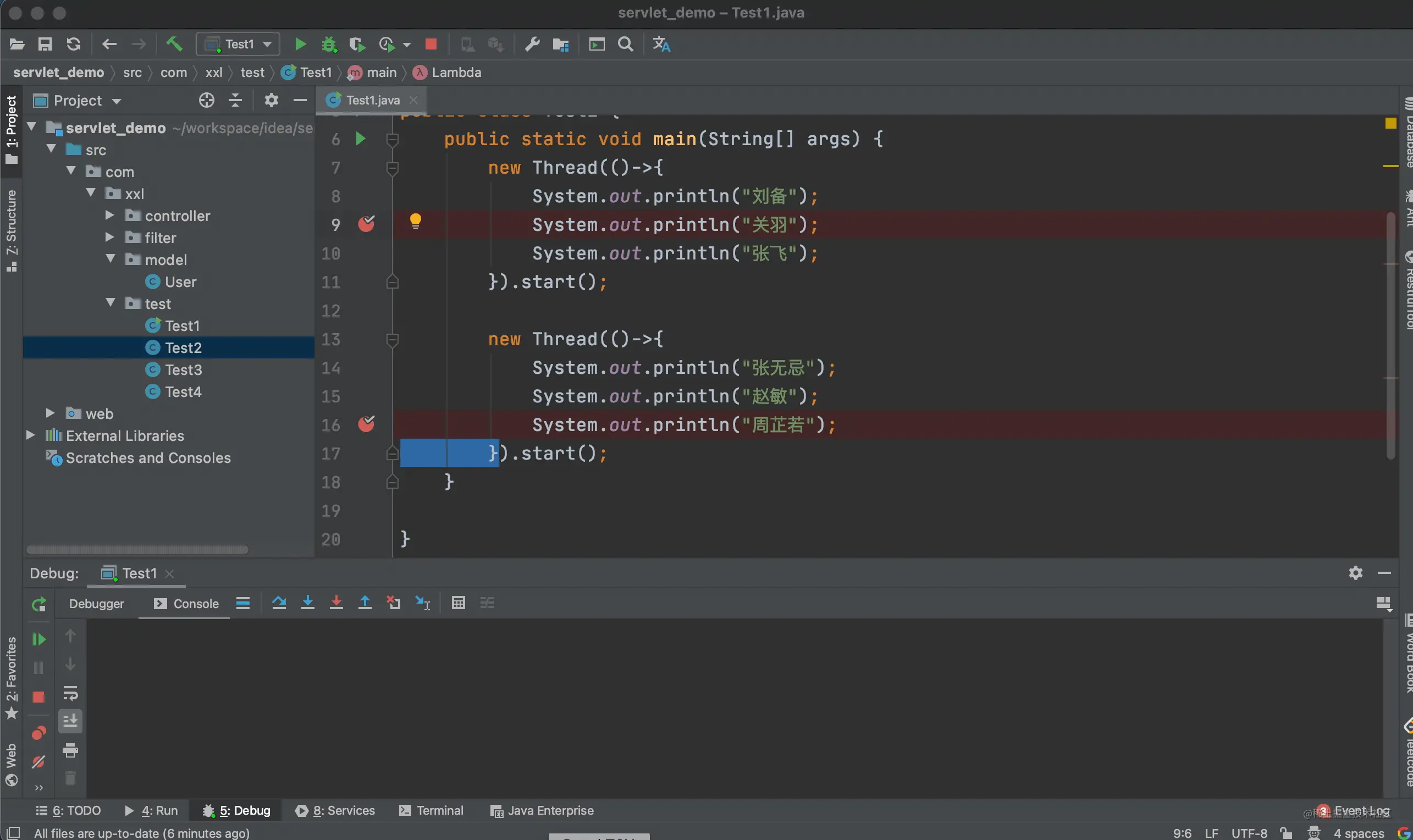 Stream结果,同样先选择行断点,以 Debug 模式进入程序:
