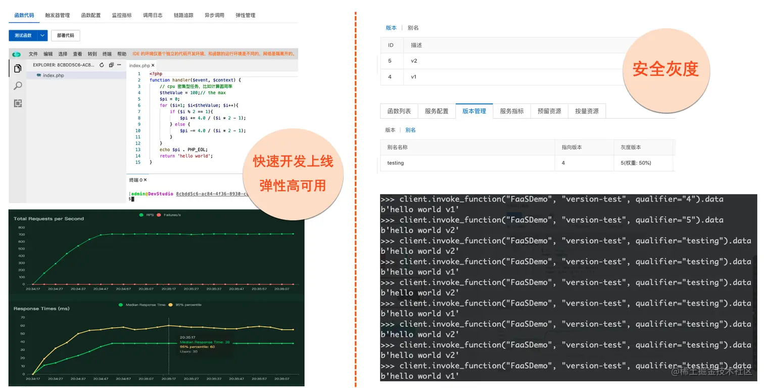 如上面陈述, 使用函数计算和传统的 PHP 开发相结合后, 您再也不用考虑负载均衡的事情, 不用考虑扩缩容的事情, 不用管理机器、担心宕机的事情等等, 只需要安安心心把业务代码开发好即可。