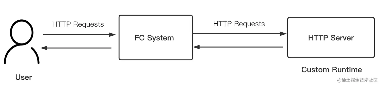 函数计算启动Custom Runtime执行环境时,会默认调用 bootstrap文件(或者您创建函数的时设置的 Args参数)启动您自定义的 HTTP Server, 然后这个HTTP Server接管了函数计算系统的所有请求,即您所有的函数调用请求。