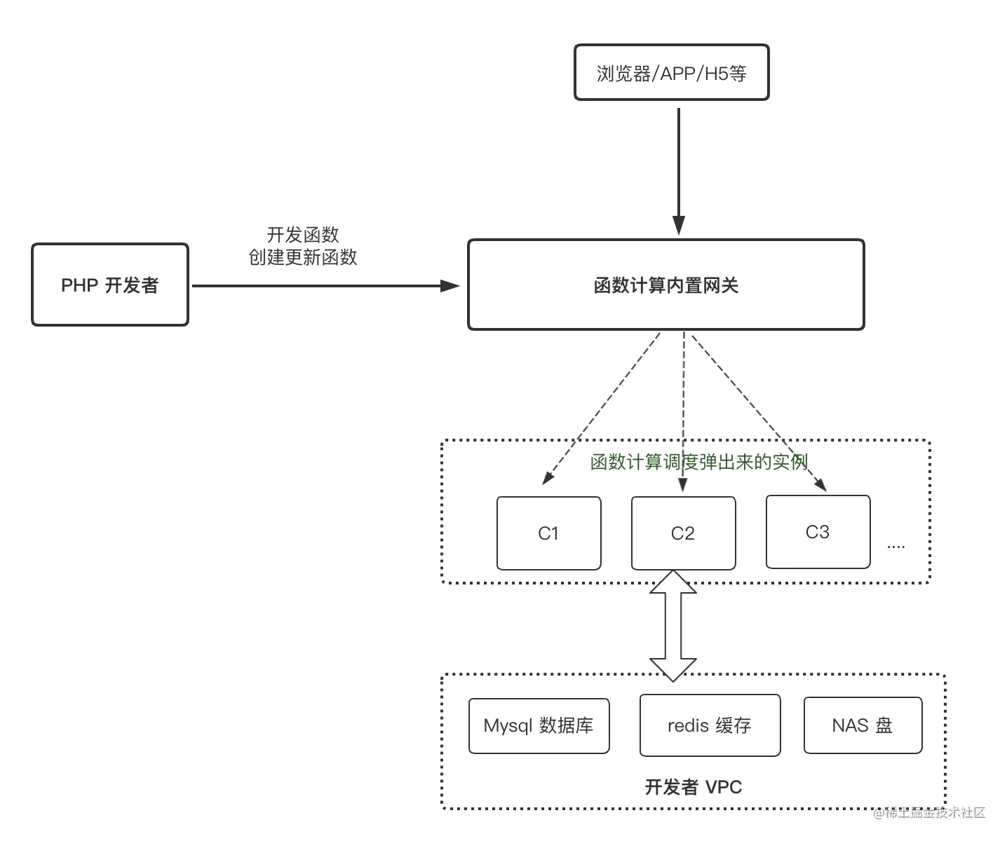 所以, 使用函数计算这个 Serverless 产品和传统的 PHP 开发相结合后, 您再也不用考虑负载均衡的事情, 不用考虑扩缩容的事情, 不用管理机器、不用担心宕机的事情等等, 只需要安安心心把业务代码开发好即可。