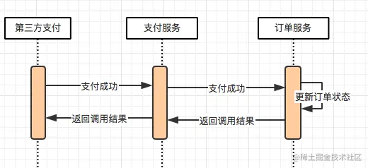 继续以电商系统为例,在微服务体系架构下,我们的支付与订单都是作为单独的系统存在。订单的支付状态依赖支付系统的通知,假设一个场景:我们的支付系统收到来自第三方支付的通知,告知某个订单支付成功,接收通知接口需要同步调用订单服务变更订单状态接口,更新订单状态为成功。流程图如下,从图中可以看出有两次调用,第三方支付调用支付服务,以及支付服务调用订单服务,这两步调用都可能出现调用超时的情况,此处如果没有分布式事务的保证,就会出现用户订单实际支付情况与最终用户看到的订单支付情况不一致的情况。