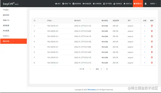 去年我们在EasyCVR中增加了操作记录功能,便于用户记录和掌握对平台的一些重要操作,如新增设备、修改、删除设备等,尤其是一些敏感操作,该功能可以记录对应的类型、操作人,以及操作的IP和详情,然后提供接口,供后期查询。